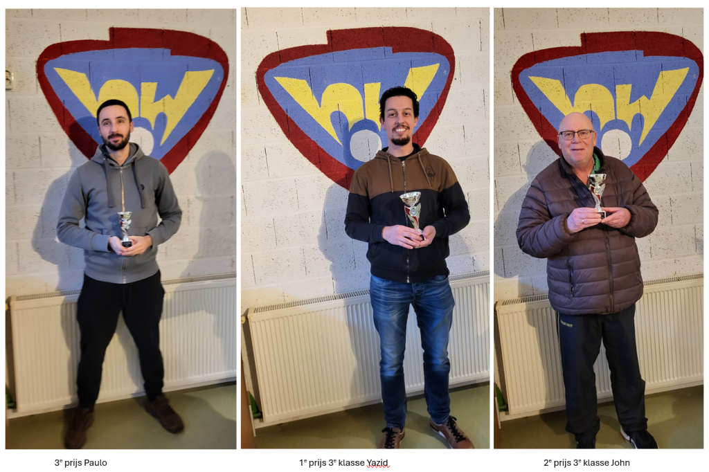 Op zaterdag 24 januari ging de strijd tussen onze 3e klassers en hoger, aangevuld met de twee sterksten van vorige week: Peter Dekker en Jerry van Es. Sjoerd was verhinderd dus Willem H. en Bert M. namen de honneurs waar. We hadden we 24 deelnemers op de been gekregen, en dat is natuurlijk een praktisch aantal. Traditiegetrouw waren aan de bar ook snert, broodje kroket en broodje-bal verkrijgbaar bij Frans P. en Paul W.