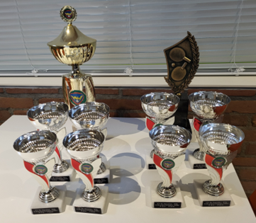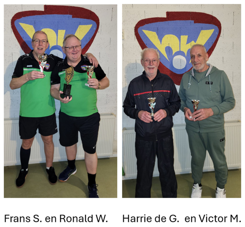 Met 12-10, 8-11, 13-11 en 11-9 (dus 3-1) ging de 1e prijs én de wisseltrofee poule B naar Frans S/Ronald W; Harrie en Victor werden eervol 2e