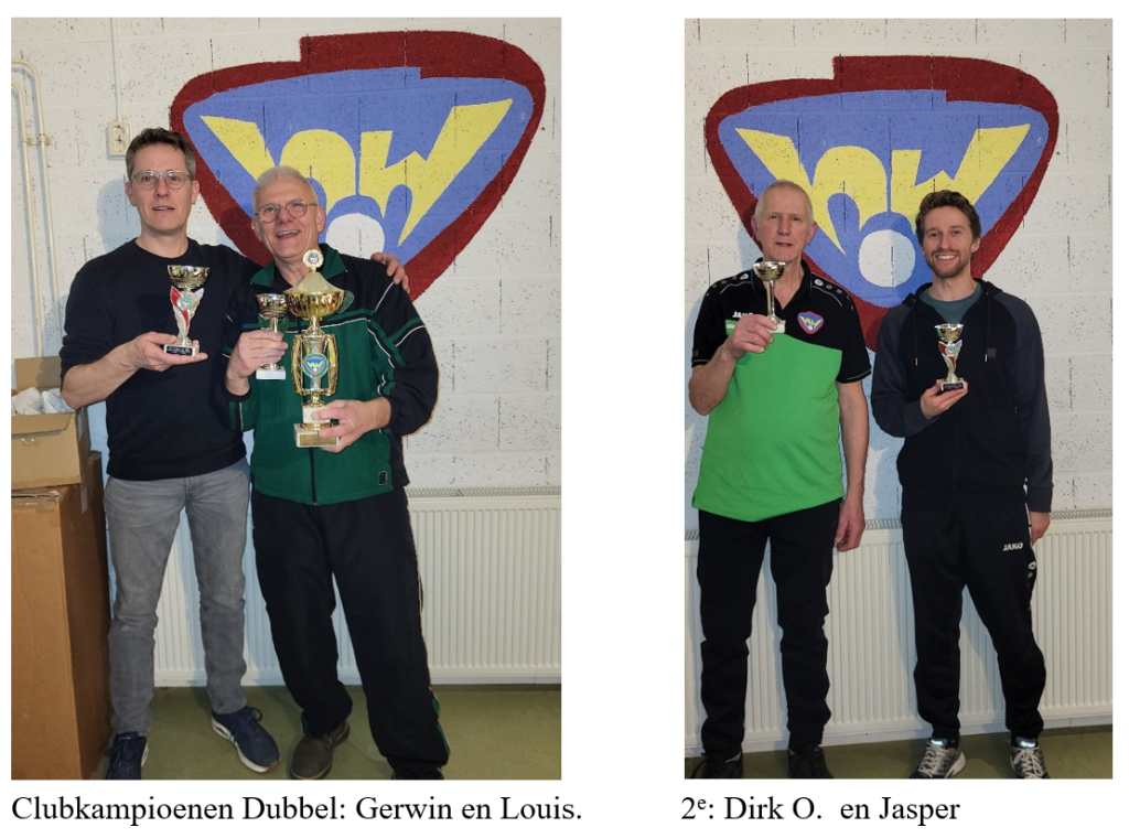 Jasper/Dirk O tegen Gerwin/Louis.Jasper/Dirk hadden de hoogste rating in de poule en hadden in de poulefase al gewonnen van Gerwin/Louis. Jasper/Dirk waren dus favoriet, maar dat zegt natuurlijk niets. Dat bleek ook: in een spannende partij trokken Gerwin/Louis met 11-7, 8-11, 13-11, 13-11 met 3-1 aan het langste eind, en werden dus gekroond tot Dubbelkampioen 2026 van TTV Het Nootwheer